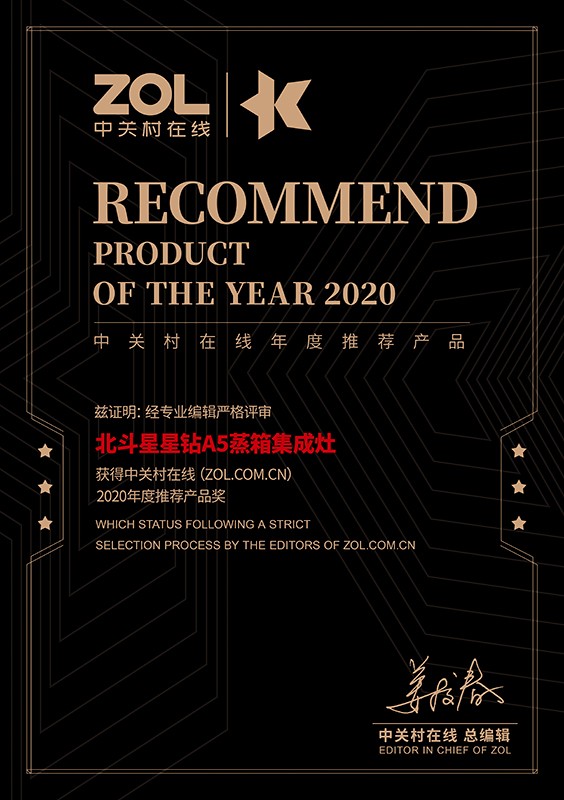 好事成雙!12月21日,由中關村聯合行業協會舉辦的科技無疆·2020年度科技產品大獎評選結果正式公布。本次評選對今年新發布上市的各類科技產品進行評估,涉及16個科技大類,80余條細分產品線。經過初選、復選和終審的層層角逐,最終,北斗星星鉆A5蒸箱集成灶榮獲ZOL“2020年度推薦產品獎”。